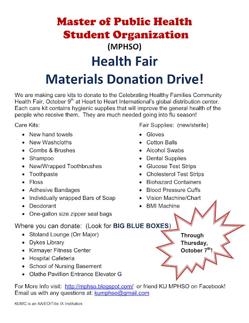 Where you can donate: (Look for BIG BLUE BOXES) Stoland Lounge, Dykes Library, Kirmayer Fitness, Hospital Cafeteria, and monetary donations go to the MPH Office in Wescoe 5021 (checks made out to Heart to Heart International)